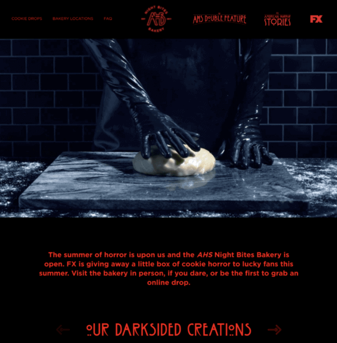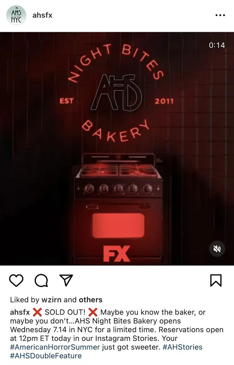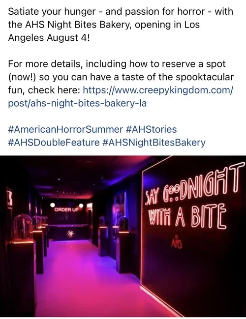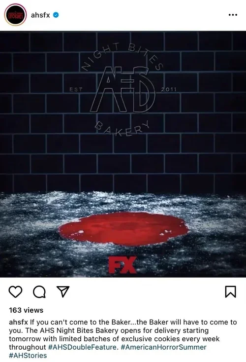 NVE Agency and FX produced a fully integrated, 360-campaign inclusive of experiential, PR, social, and digital elements. The teams wanted to create synergy between the show themes and on-the-ground activation, feeding into the #AmericanHorrorSummer overarching campaign while hinting at the blood-thirsty themes of American Horror Stories and AHS: Double Feature. As a result, NVE ideated and produced "AHS NIGHT BITES BAKERY," a macabre after-dark bakery serving sweet treats that celebrated the 10-year legacy of AHS. The multi-channel strategy came to life as a 360-campaign that included limited in-person pop-ups, online experiences, and amplification tactics such as influencer engagement, social media teasers and pre-market publicity to drive tune-in for the new Stories series and AHS: Double Feature, as well as to promote overall AHS viewership.